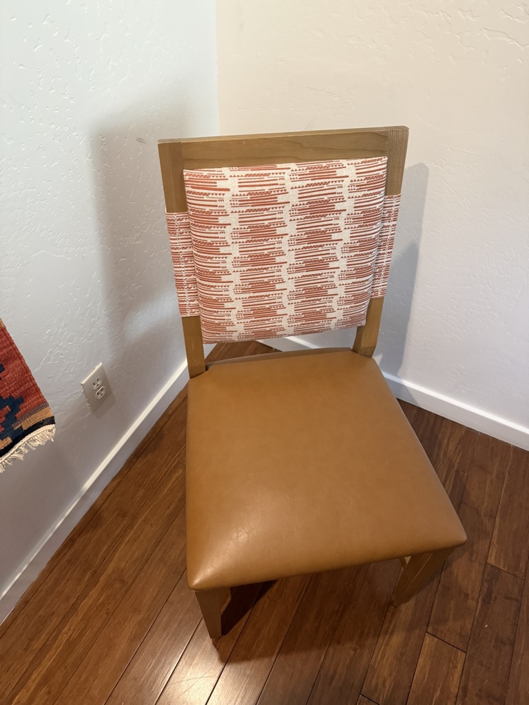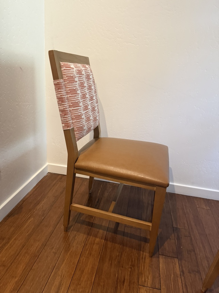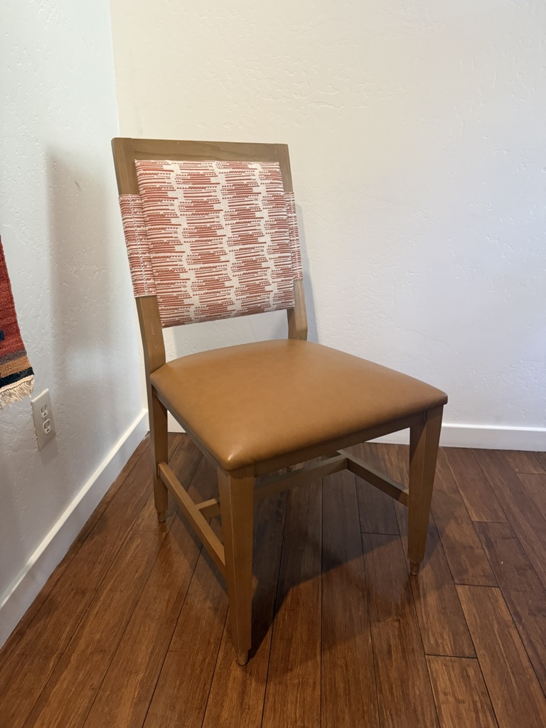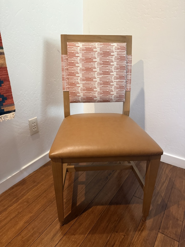 Chairs have leather seats with fabric backs. 36″ tall and 19″ wide