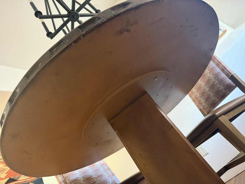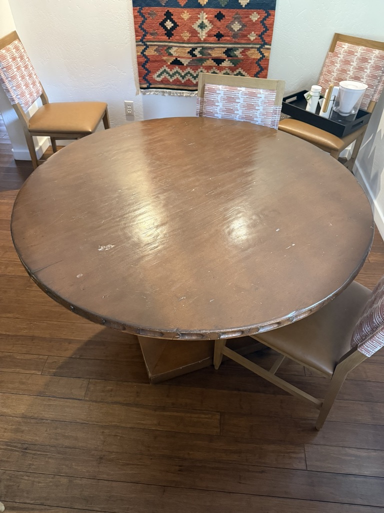 Table is a pedestal style. 50″ wide and 30″ tall.